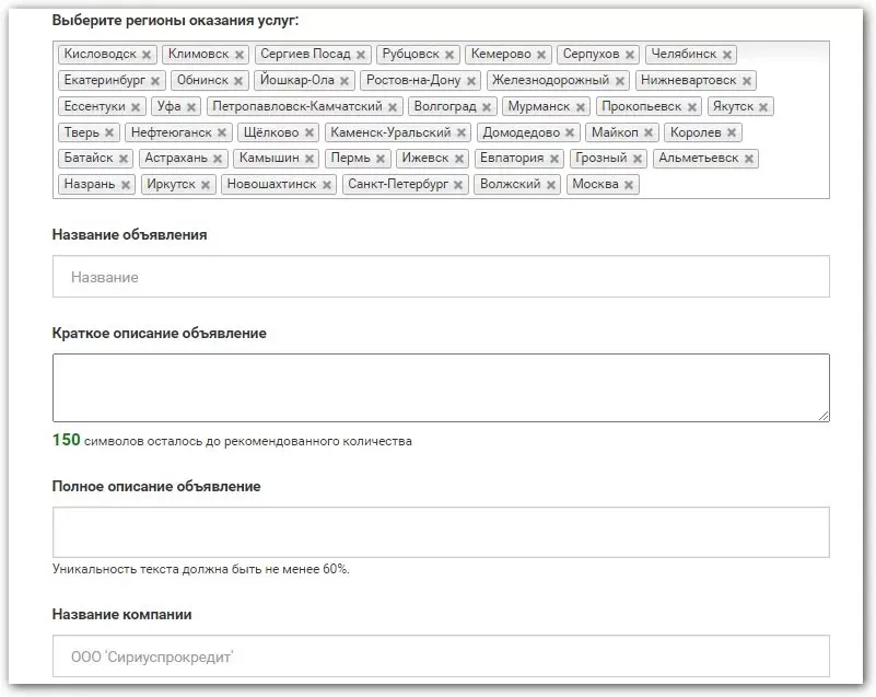 Для размещения не нужно указывать название компании и ОГРН. Достаточно телефона, адреса email и имени. Правда, есть ограничение: в тексте объявления должно содержаться не больше 1000 символов с учетом пробелов.