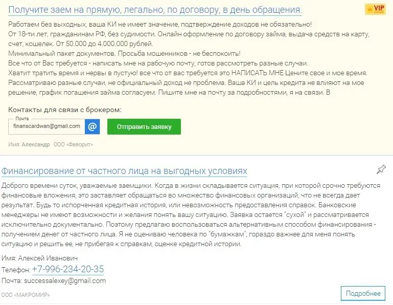 Это сайты, на которых инвесторы выкладывают предложения услуг и контакты, а заемщики могут обращаться к ним — звонить или писать на email. Их много, вот некоторые из них: