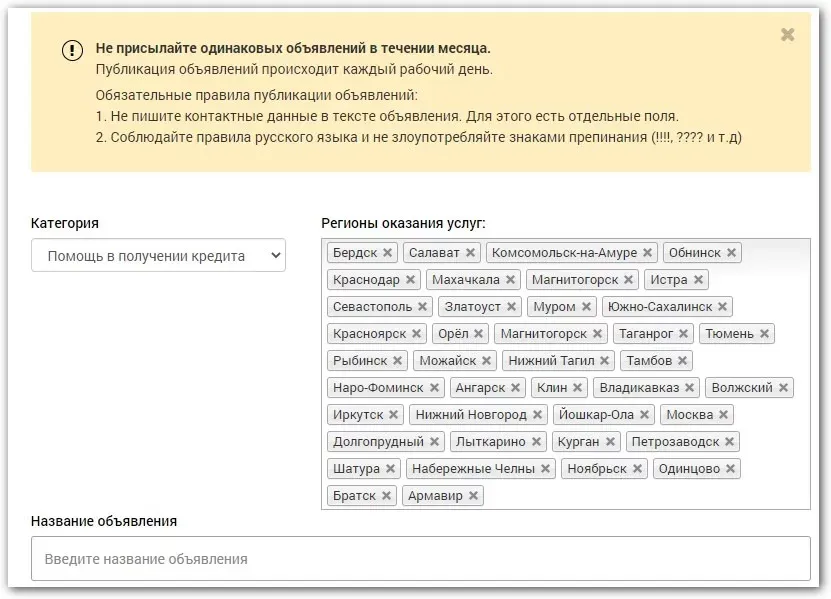 Так выглядит форма для добавления объявления на площадку