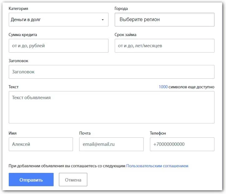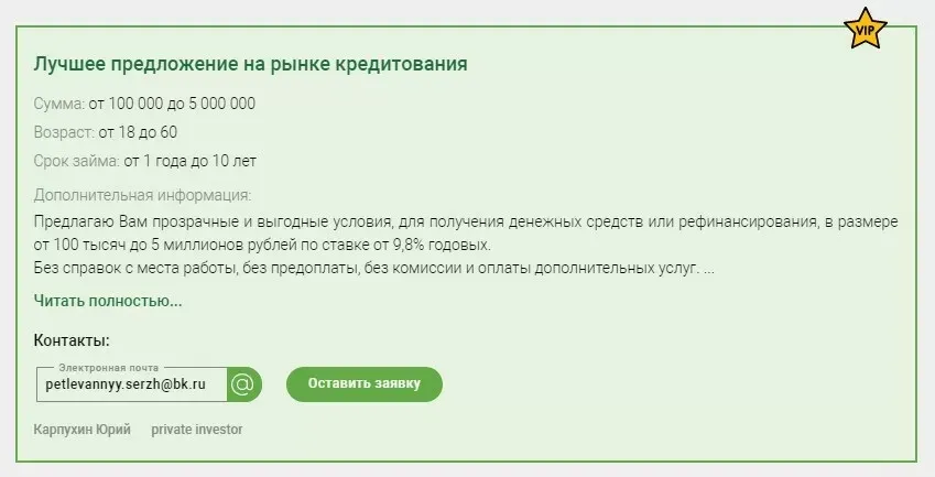На подобных площадках высокая конкуренция, и большинство пользователей не идут дальше первой странице. Чем выше вы будете в каталоге предложений, тем больше заявок от заемщиков сможете получить, поэтому лучше покупать VIP или часто обновлять объявления.